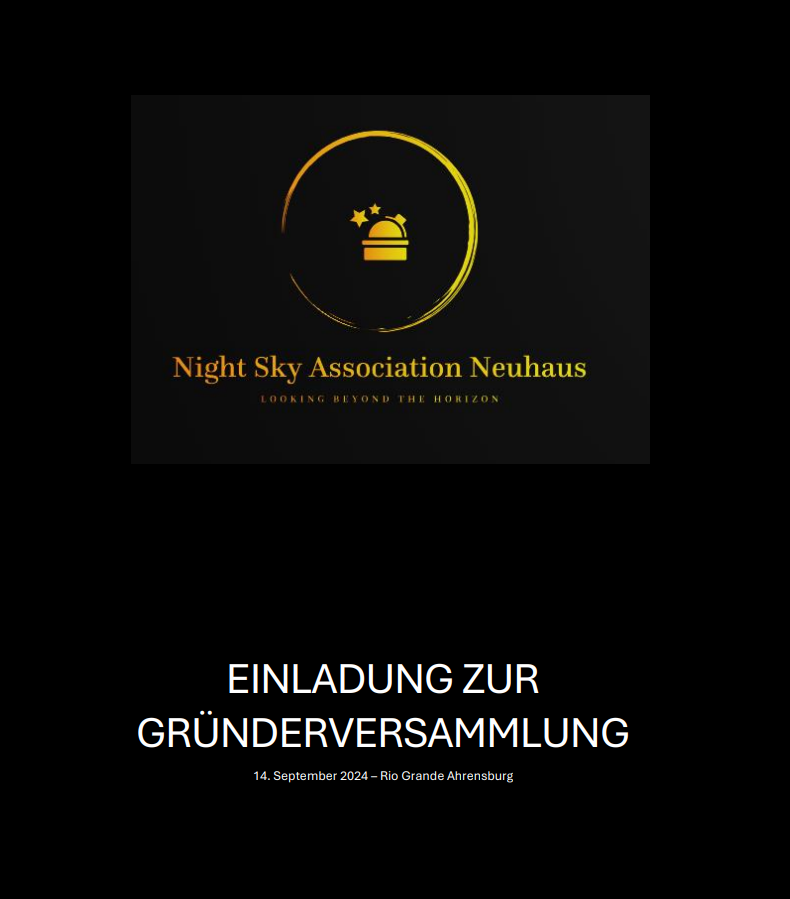 Somit dürfen wir uns aber jetzt ganz offiziell als Night Sky Association Neuhaus e.V. betiteln. Es ist aber noch viel Arbeit vor uns – trotzdem freut uns jeder erfolgreiche Schritt.