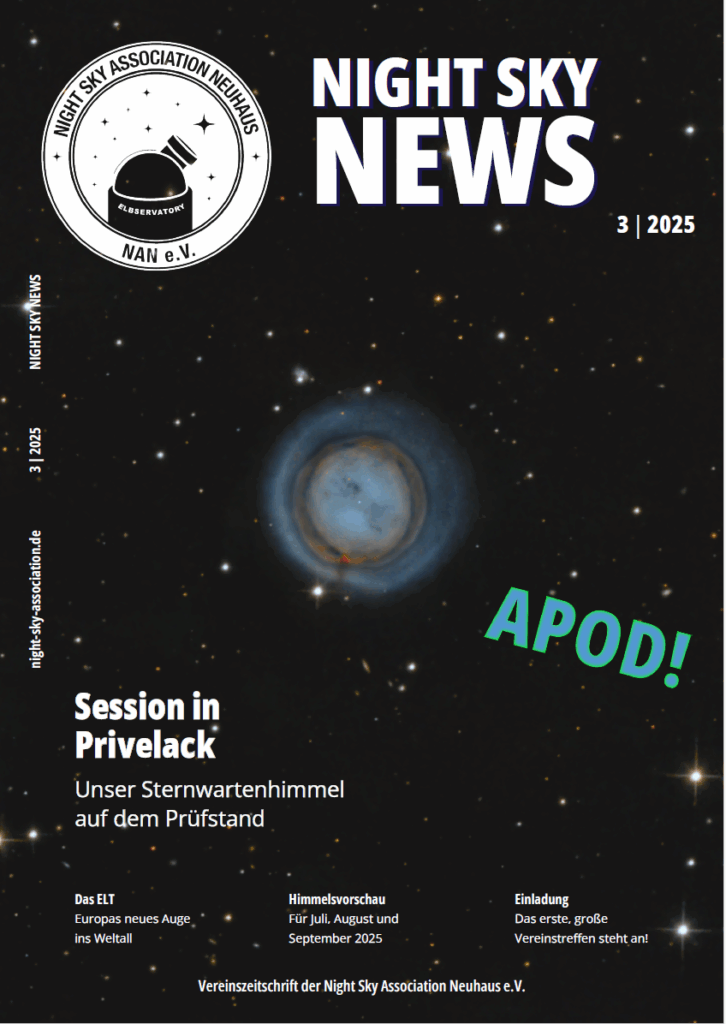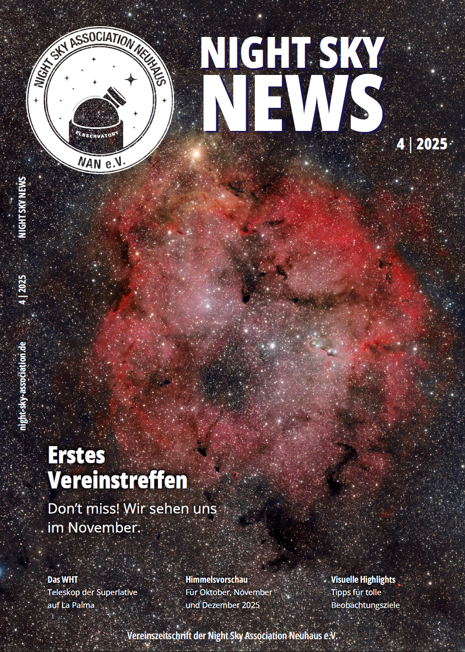 Heute am 04. Oktober 2024 ist die erste Ausgabe unserer Vereinszeitschrift „Night Sky News“ erschienen. Auf prall gefüllten 33 Seiten gibt es u.a. eine Himmelsvorschau für die kommenden Monate, Spannendes zum Thema der Bortle Skala und und und. Die Zeitschrift könnt ihr im Mitgliederbereich ab sofort downloaden.