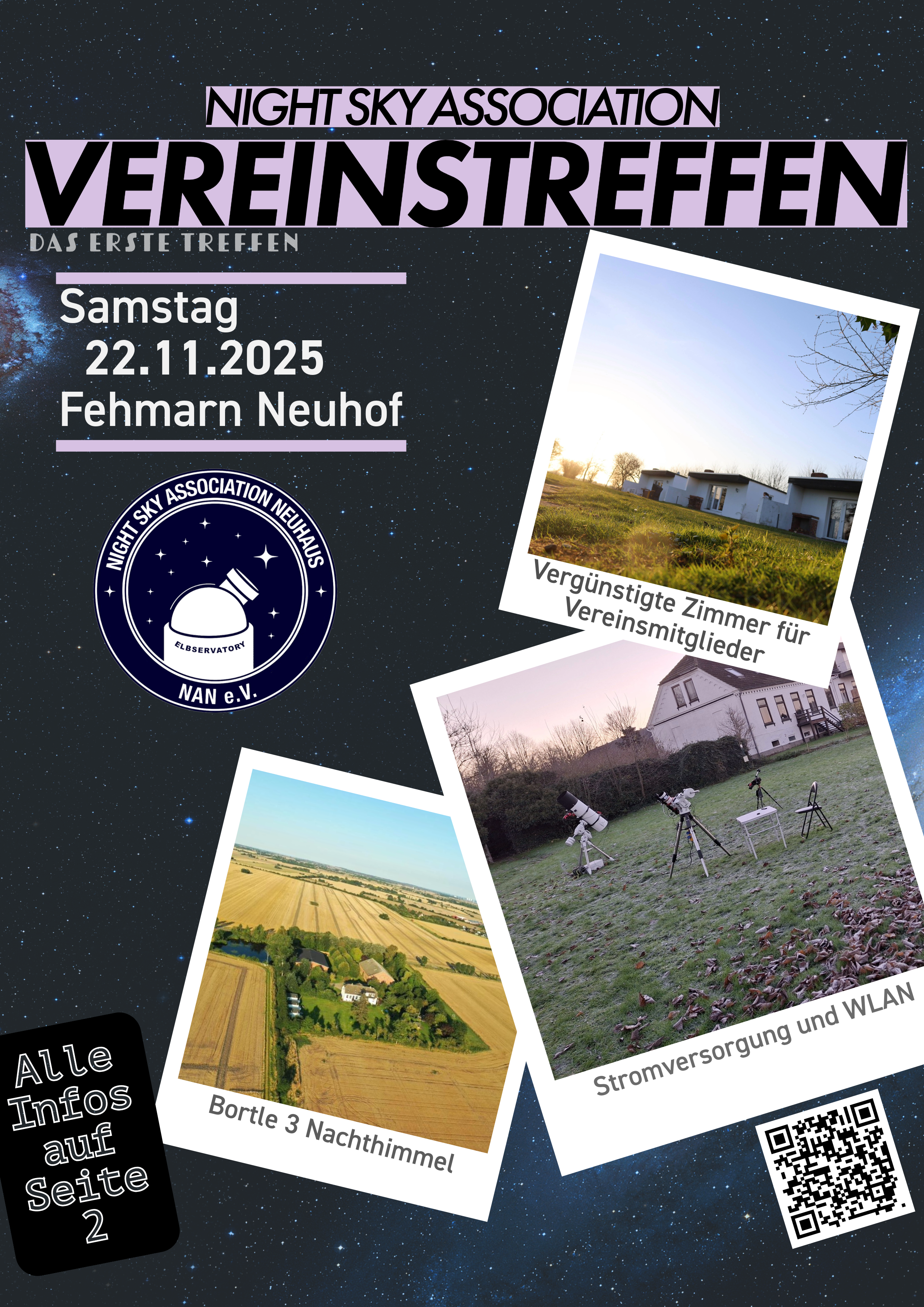 Auf der Insel Fehmarn – wo der Himmel noch richtig dunkel ist – gibt es einen kleinen Ferienhof mit kleinen Bungalows, einer Wiese mit Stromanschlüssen, eine Grill-Hütte und jeder menge gleichgesinnter Astronomiebegeisteter. Vereinsmitglieder erhalten zudem die Zimmer günstiger 🙂